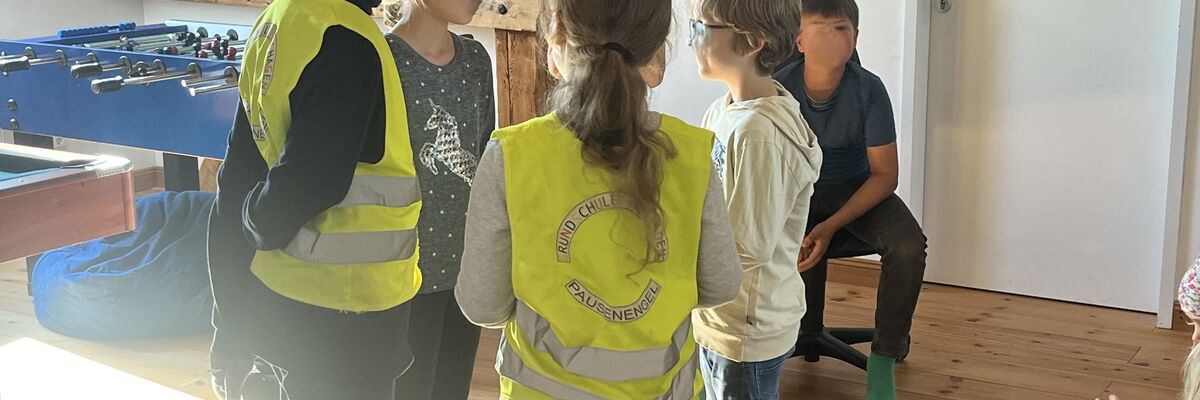 In jeder großen Pause sind auf unserem Schulhof zwei Pausenengel unterwegs. Unsere Pausenengel sind Schülerinnen und Schüler der 4. Klassen, die Ansprechpartner, Helfer und Tröster für alle Kinder der Schule sind.