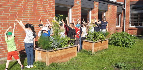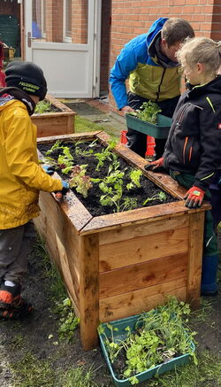 Im November 2023 hat die Klasse 2b mit dem Team des „Eutiner Küchengarten“ und der Klassenlehrerin Frau Bauer drei neue Hochbeete aufgebaut und für die Bepflanzung im Frühjahr vorbereitet. Die Schüler lernen im Sachunterricht, wie ein Hochbeet angelegt werden muss und welche Pflanzen dort gut gedeihen. Am 26. April kam das Team aus Eutin wieder, um mit den Kindern die Pflanzen zu besprechen und anschließend in die Hochbeete zu pflanzen. Der Schwerpunkt der Gartenarbeit liegt auf den Aspekten: