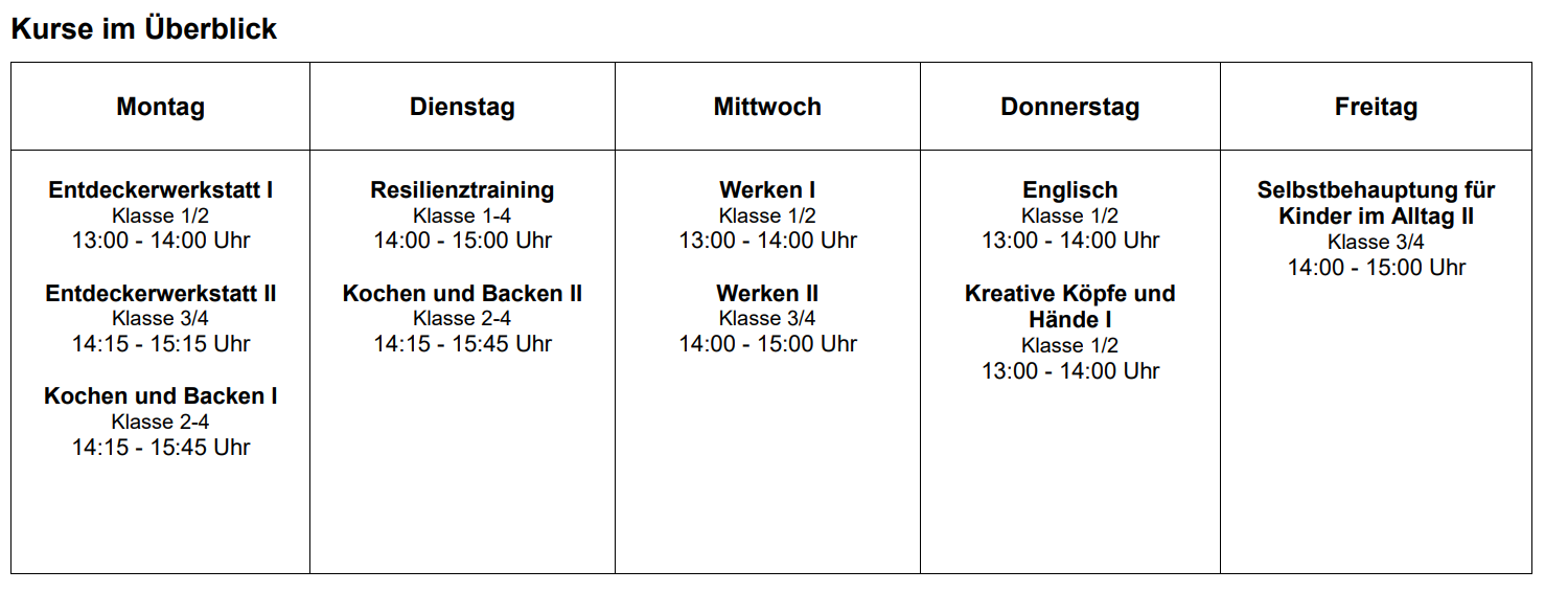 Alle Kursangebote sind freiwillig! Erst mit der Anmeldung entsteht eine Verbindlichkeit für ein Schulhalbjahr. Es können maximal 5 Kurse und höchstens einer pro Tag gewählt werden. Damit ein Kurs stattfinden kann, müssen sich mindestens 10 Kinder anmelden!